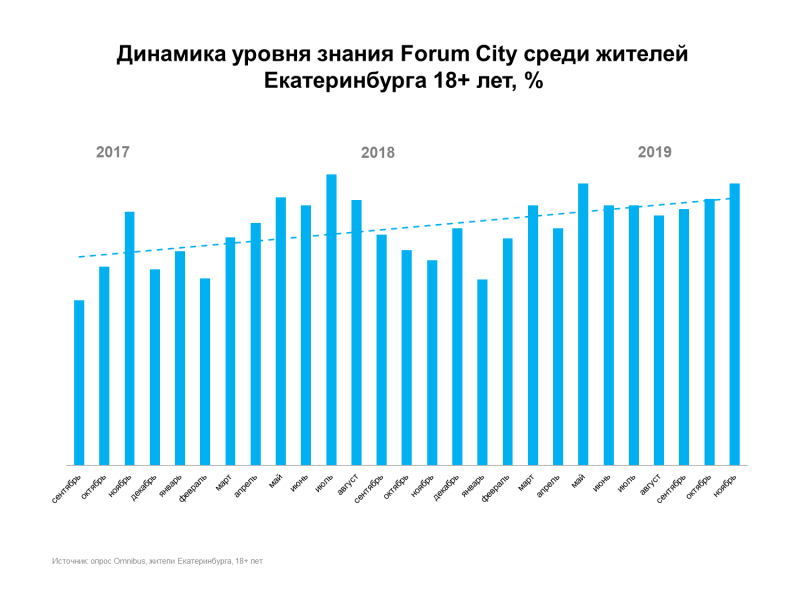 За первый год присутствия на сверхконкурентном рынке, нам удалось сформировать устойчивое знание объекта и его атрибутов. Среднегодовое значение уровня знания Forum City среди жителей Екатеринбурга в возрасте 18+ лет за 2017−2019 гг. выросло на 6,8 процентных пунктов.