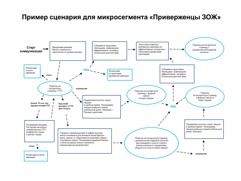 Для каждого микросегмента целевой аудитории были разработаны сценарии взаимодействия от первого контакта до покупки с использованием персонализированных креативов и динамической подмены контента.