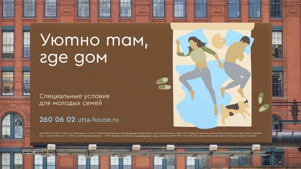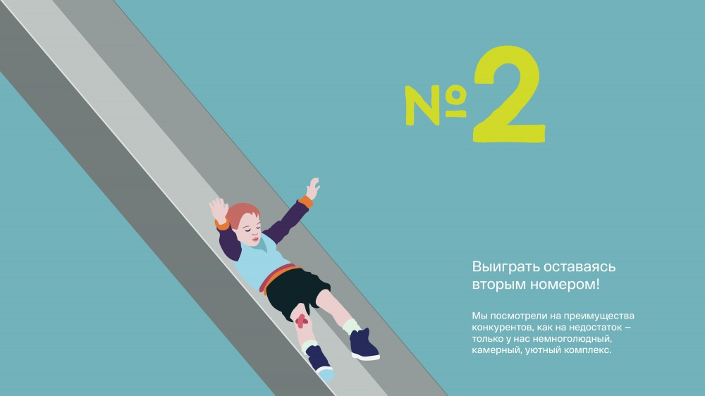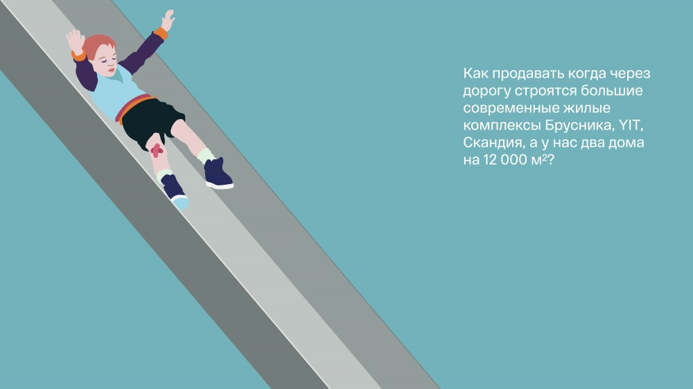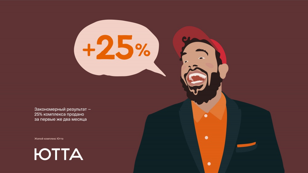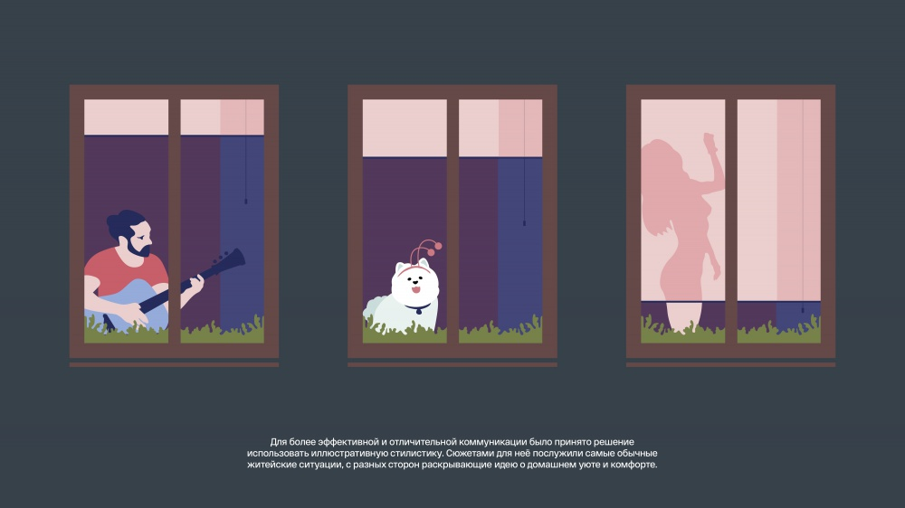 Мы посмотрели на преимущества конкурентов, как на недостаток — только у нас немноголюдный, камерный, уютный комплекс. Для более эффективной и отличительной коммуникации было принято решение использовать иллюстративную стилистику. Сюжетами для неё послужили самые обычные житейские ситуации, с разных сторон раскрывающие идею о домашнем уюте и комфорте. Закономерный результат — 25% комплекса продано за первые же два месяца